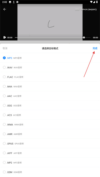 4、从列表中选定音频格式,如MP3,选好后点击完成的按钮。