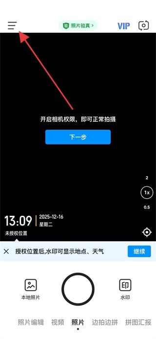 1、打开今日水印相机APP,点击左上角三条横线图标,弹出功能菜单。