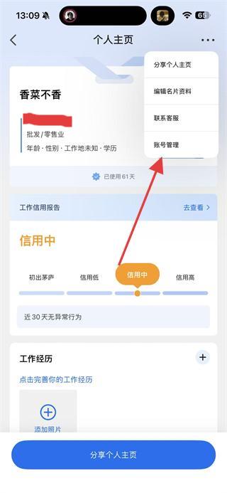 3、在个人主页页面右上角,点击三点图标展开菜单,选择账号管理选项进入设置页面。