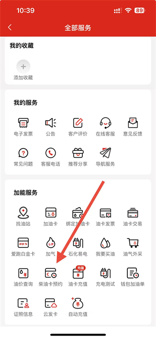 2、在全部服务的加能服务板块中,找到并点击柴油卡预约选项,进入柴油卡预约页面。