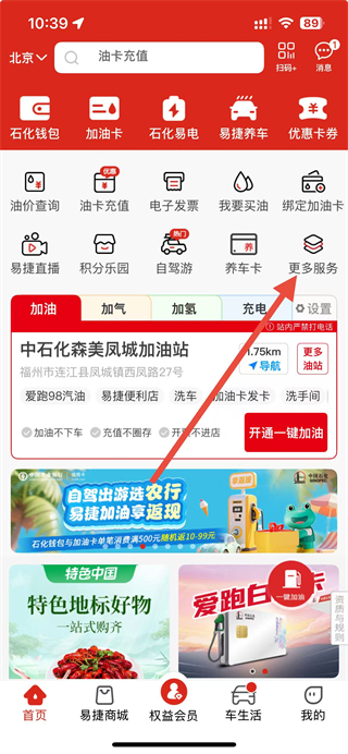 1、打开易捷加油app,在首页点击更多服务选项,进入全部服务页面。
