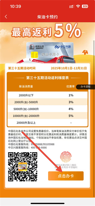 3、在该页面查看活动信息后,点击点击办卡按钮,按提示完成柴油加油卡的预约办理操作。