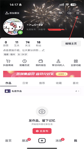 2、在个人页面右上角,点击三条横线样式的菜单按钮。