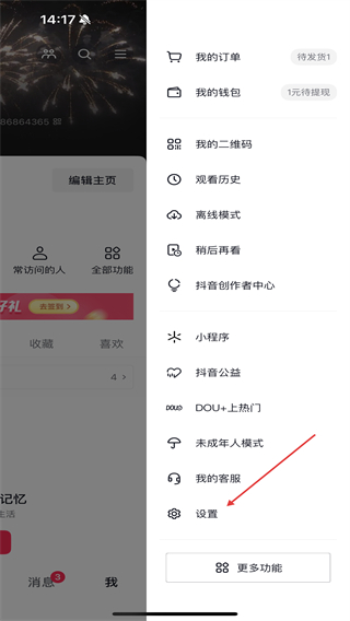 3、在功能列表中,选择设置选项,进入抖音的设置界面。