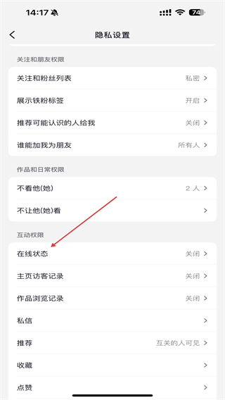 5、在隐私设置页面中,找到在线状态的选项并点击。