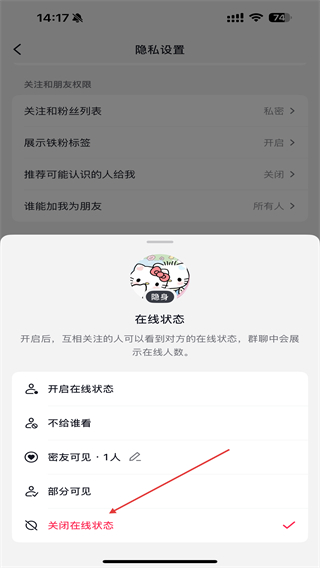 6、在弹出的选项里选择关闭在线状态,即可完成隐身在线的设置。