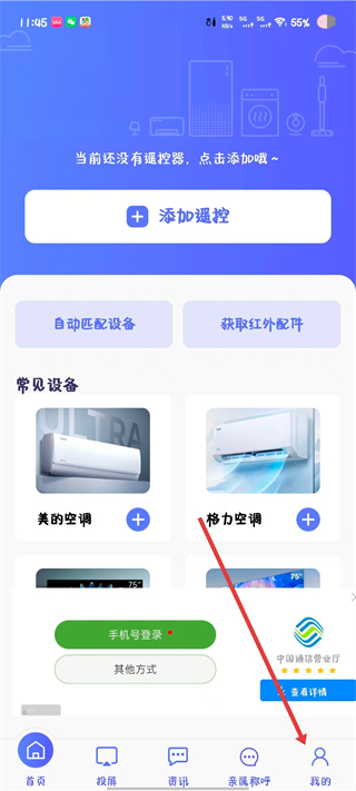 1、打开空调智能遥控应用的首页,点击导航栏最右侧的我的选项,进入个人中心页面。