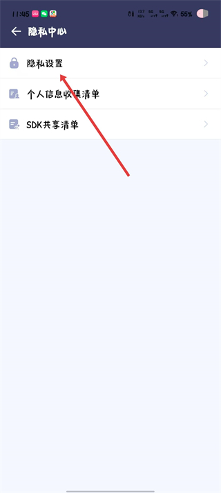 3、在隐私中心界面,选择隐私设置选项,点击该选项进入应用的权限管理页面。