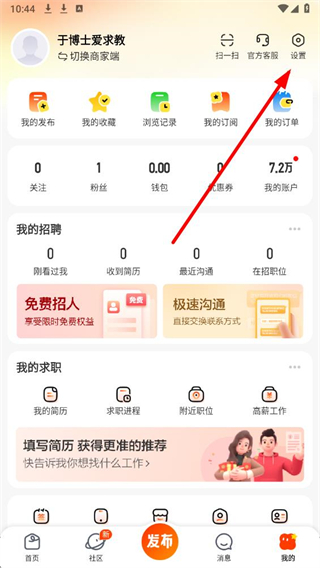 1、打开58同城APP后,点击进入我的页面,点击右上角齿轮形状的设置图标,进入设置的界面。