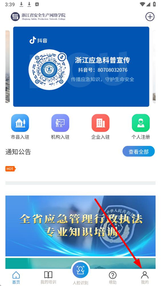 1、打开浙江省安全生产网络学院APP后,找到页面底部我的选项并点击,进入我的界面。