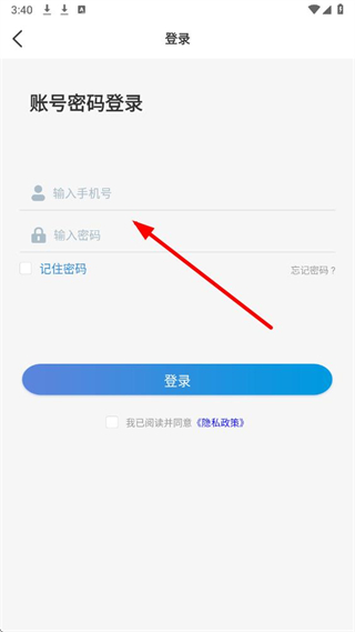 3、进入登录页面后,依次输入手机号和密码,勾选同意隐私政策后,点击登录按钮,即可完成登录操作。