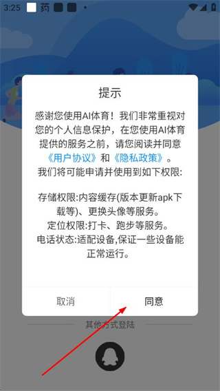 1、打开AI体育app,在弹出的提示弹窗中点击“同意”按钮,进入登录页面。