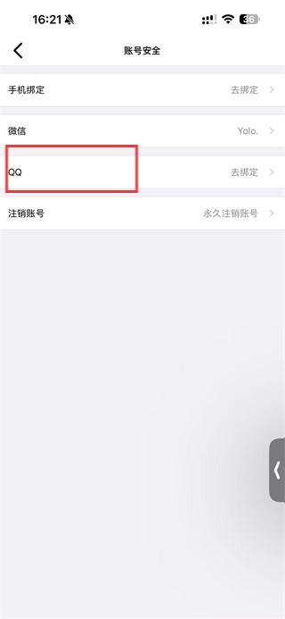 4、在账号安全页面,找到QQ选项并点击去绑定,按提示完成QQ账号的授权绑定操作。