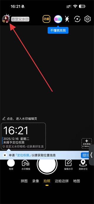 1、打开自定义水印相机应用,点击左上角的头像进入个人中心。