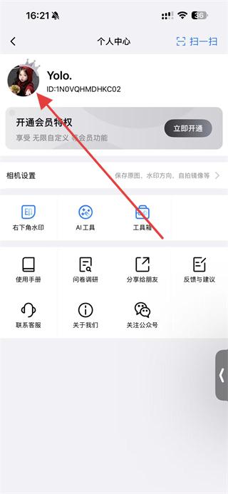 1、打开自定义水印相机app,点击左上角的头像区域,进入个人中心页面。