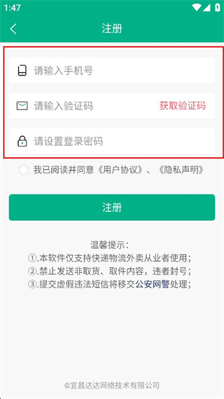 3、在注册页面依次填写手机号、获取并填写验证码,再设置对应的登录密码。