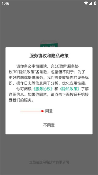 1、打开快递短信宝软件,查看服务协议和隐私政策弹窗,点击界面中的“同意”按钮。
