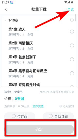 3、在批量下载页面,点击全选选项,选中需下载的小说章节点击确定。