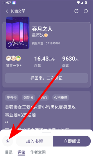 2、当我们进入这本小说的详情页,需要继续点击立即阅读的按钮,进入小说章节内容的阅读界面。