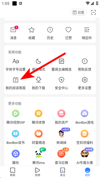 2、在常用功能区域中,找到我的阅读周报入口并点击,进入阅读周报页面。