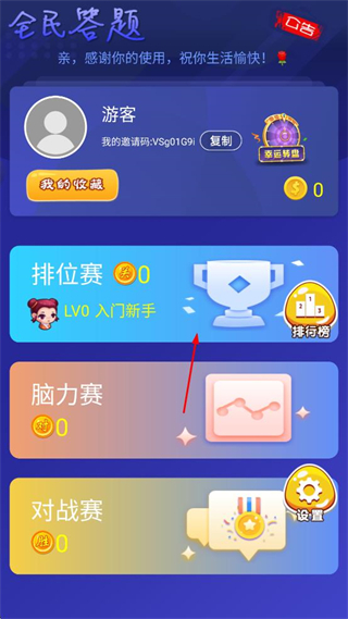 1、进入全民答题主界面,找到排位赛板块,点击该板块进入排位赛答题页面。