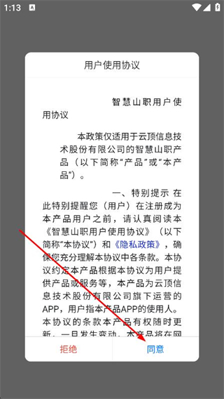 1、打开智慧山职APP,在协议弹窗中点击同意。