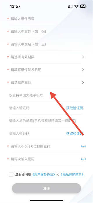 3、在注册页面依次填写信息,勾选同意协议后,点击注册按钮,完成账号注册操作。