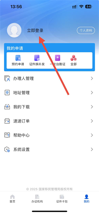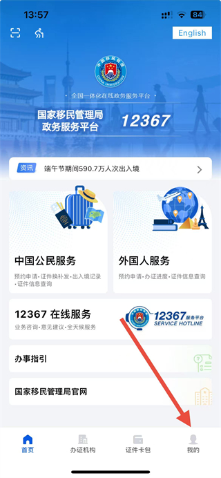 1、打开国家移民管理局政务服务平台app,点击底部我的选项,进入个人界面。