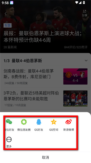 3、在内容详情页,点击右上角分享按钮,弹出分享选项。