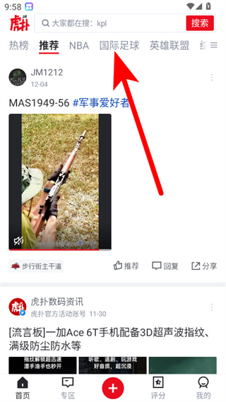 1、在虎扑首页,点击上方国际足球选项,进入对应专区。