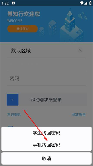 2、在弹出的选项中,选择并点击手机找回密码,进入找回密码页面。
