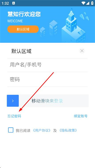 1、打开慧知行初中版APP,在登录页面点击下方的忘记密码选项。