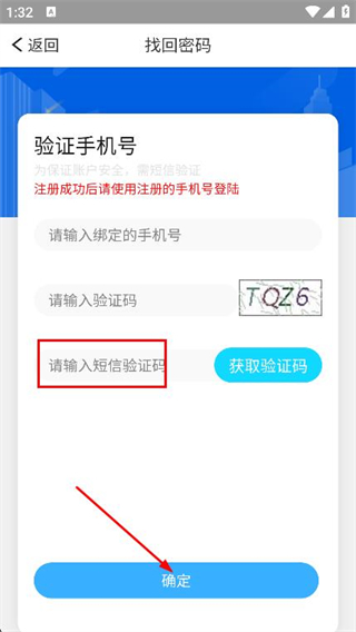 4、填入收到的短信验证码,点击确定按钮,即可完成密码找回。