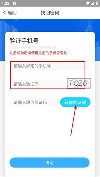 3、在找回密码页面,填写手机号和图形验证码,并获取验证码。