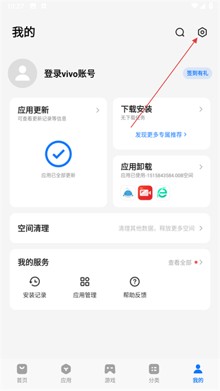 1、打开vivo应用商店进入首页,点击底部导航栏的我的选项进入个人界面。