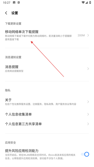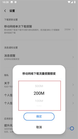 3、在设置页面找到移动网络单次下载提醒选项,点击该选项弹出额度选择窗口。