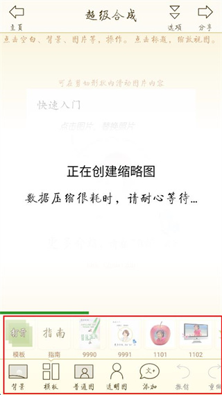 4、在超级合成页面等待缩略图创建完成,可选择底部模板等功能进行后续操作。