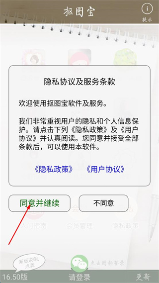 1、打开抠图宝软件,查看弹出的隐私协议及服务条款,点击同意并继续按钮进入主界面。