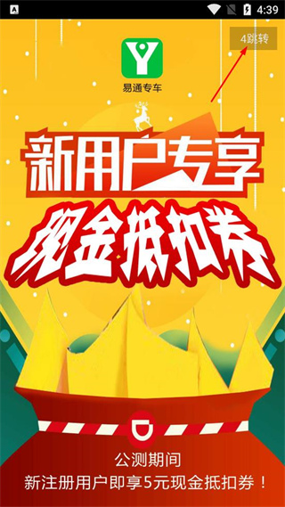 1、打开易通专车,看到新用户专享页面,点击右上角的4跳转按钮,进入对应界面。