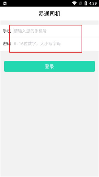 2、进入易通司机页面,找到手机输入框填写手机号码,再在密码框按要求设置密码。