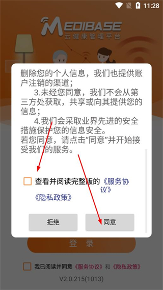 1、打开远联健康app,在弹出的服务协议与隐私政策提示框中,勾选后点击同意。