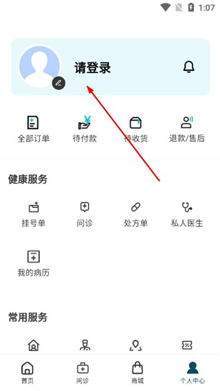 2、在个人中心页面,点击请登录区域,进入账号登录/注册页面。