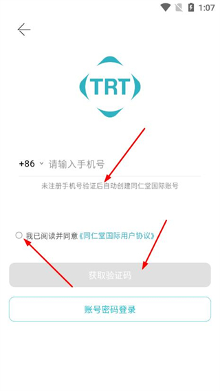 3、在登录/注册页面,输入要注册的手机号,勾选我已阅读并同意协议后,点击获取验证码。