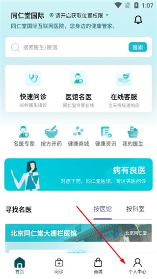 1、打开同仁堂国际app首页,点击底部导航栏的个人中心。