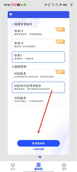 1、打开光速虚拟机APP,选择界面选择安卓版本和架构,点击新建虚拟机。
