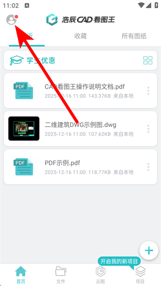 1、打开浩辰CAD看图王APP,点击界面左上角的头像图标。