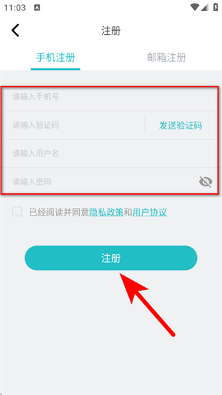 4、选择手机注册,依次填写手机号等信息后,点击注册完成操作。