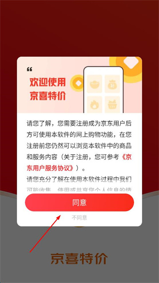 1、打开京喜特价APP,查看弹出的协议说明内容,确认后点击页面中的同意。