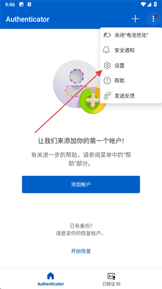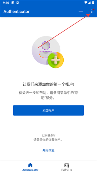 1、打开微软身份验证器主界面,点击右上角三点图标,展开功能菜单。