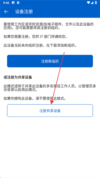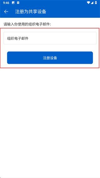 5、进入注册为共享设备页面之后,输入组织电子邮件后点注册设备。
